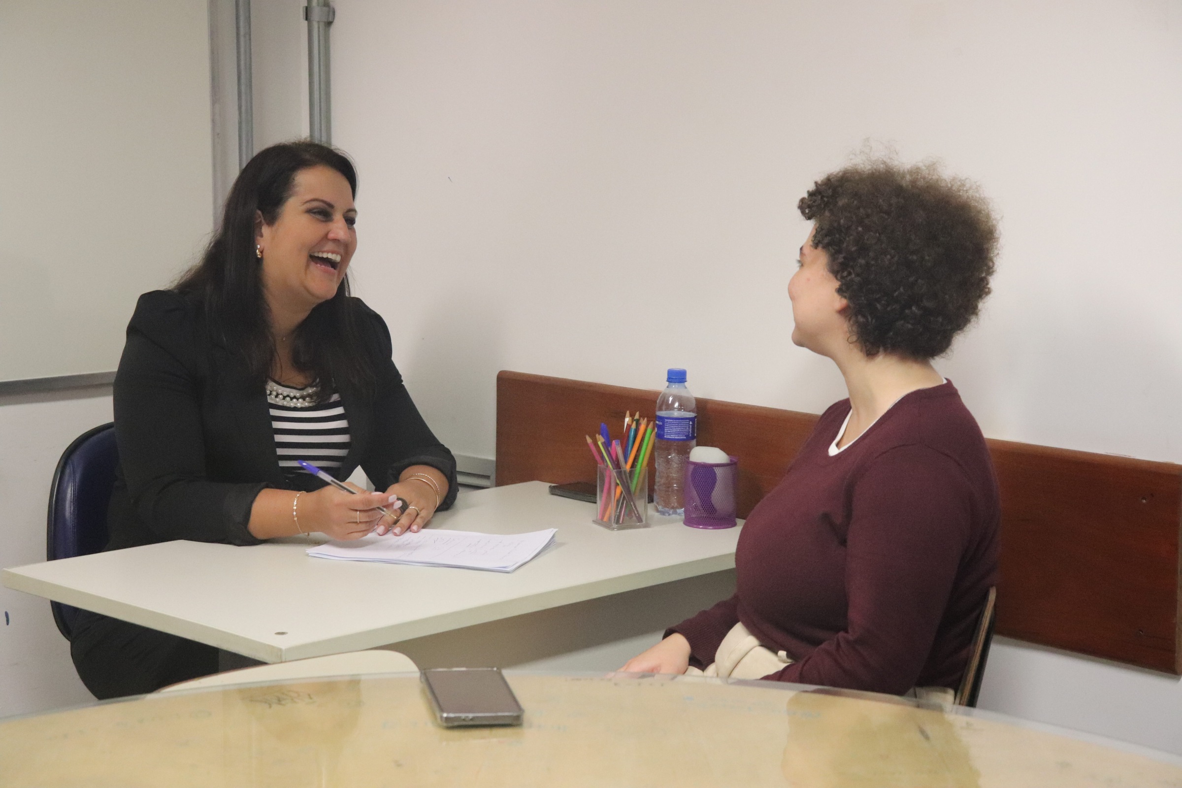 A oficina ocorreu em duas etapas: na primeira, os alunos passaram por uma simulação real de entrevista de emprego, com perguntas sobre o seu perfil e suas características marcantes, além de uma troca sobre o mercado de trabalho.